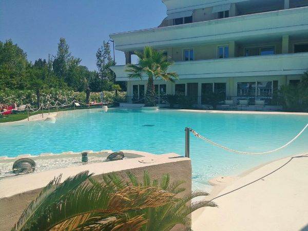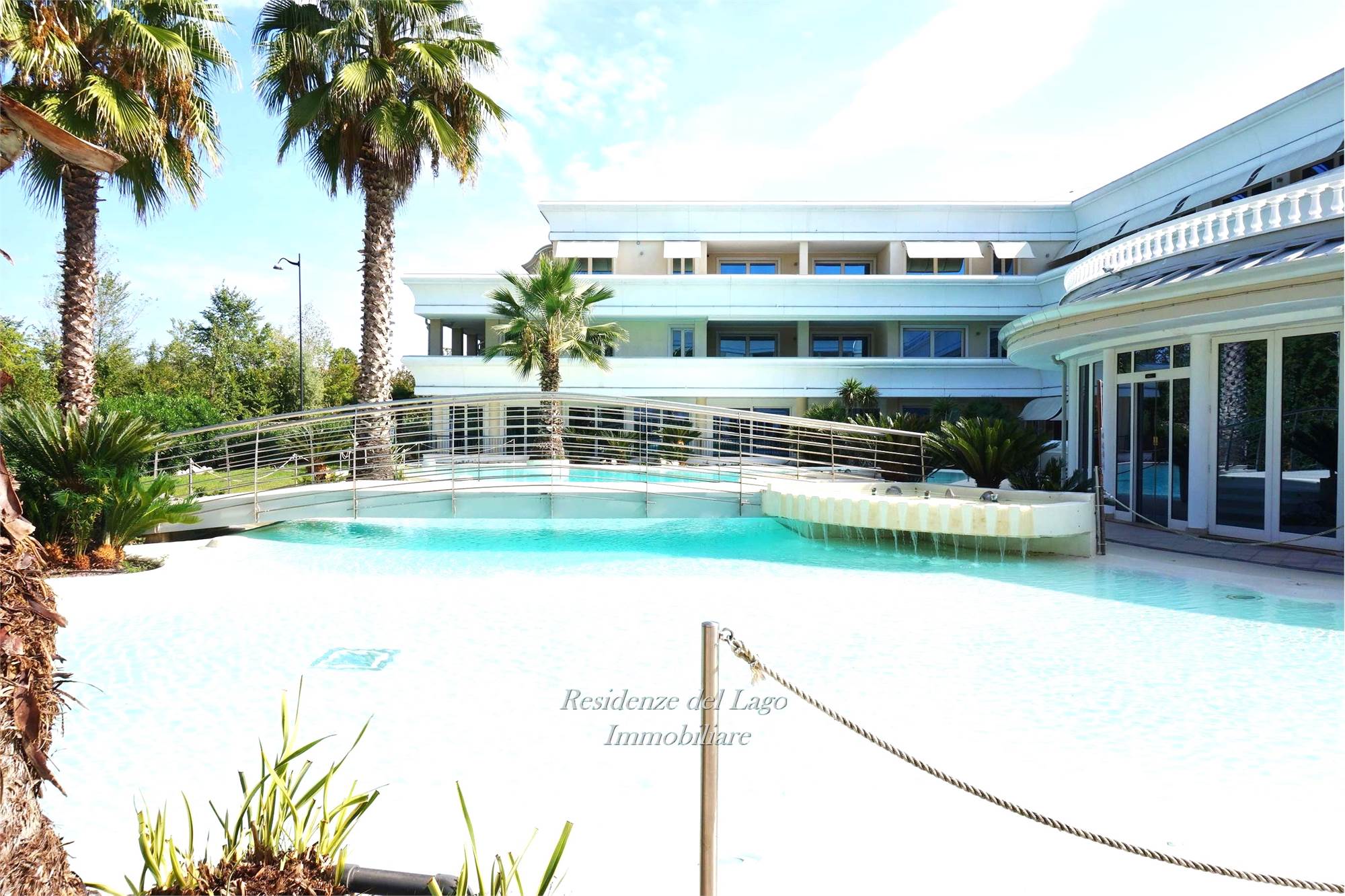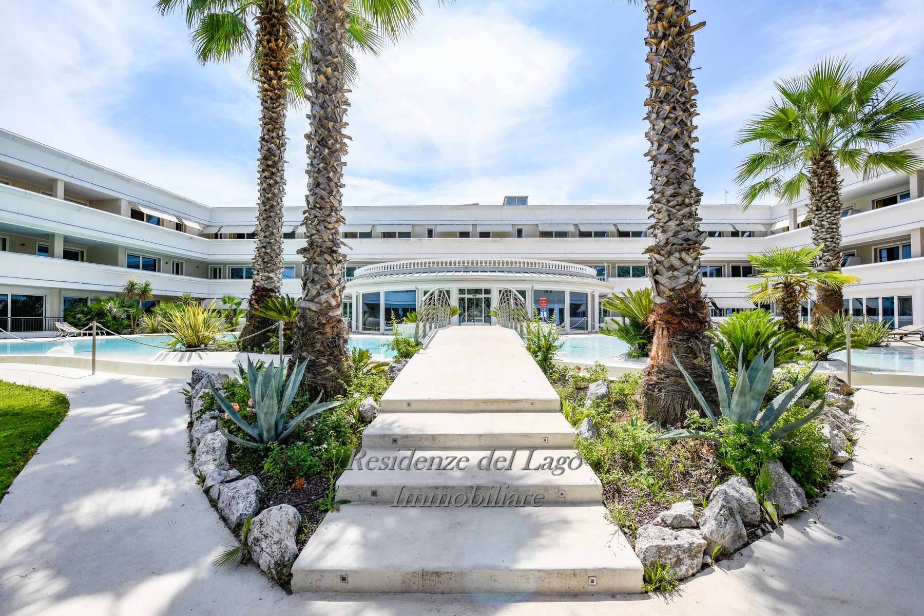 AN DER GRENZE ZWISCHEN DESENZANO D/G UND SIRMIONE bieten wir eine geräumige und elegante Zweizimmerwohnung im Erdgeschoss mit Terrasse in einer exklusiven Residenz mit malerischem Pool.
