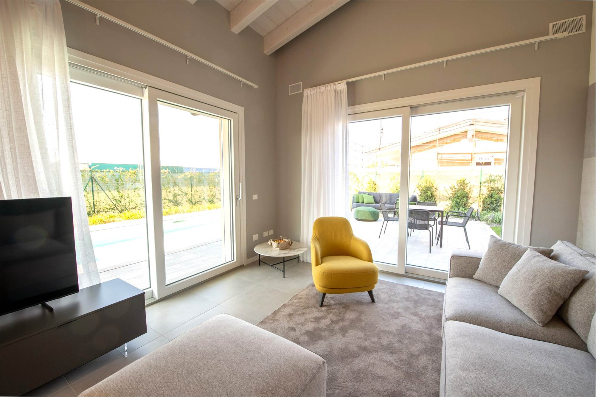 The ground floor features a bright, open-plan living area, consisting of a living room and open-plan kitchen. Large sliding windows seamlessly connect the interior spaces with the elegant outdoor porch, ideal for dining and relaxing, with a panoramic view of Padenghe Castle and direct access to the infinity pool.