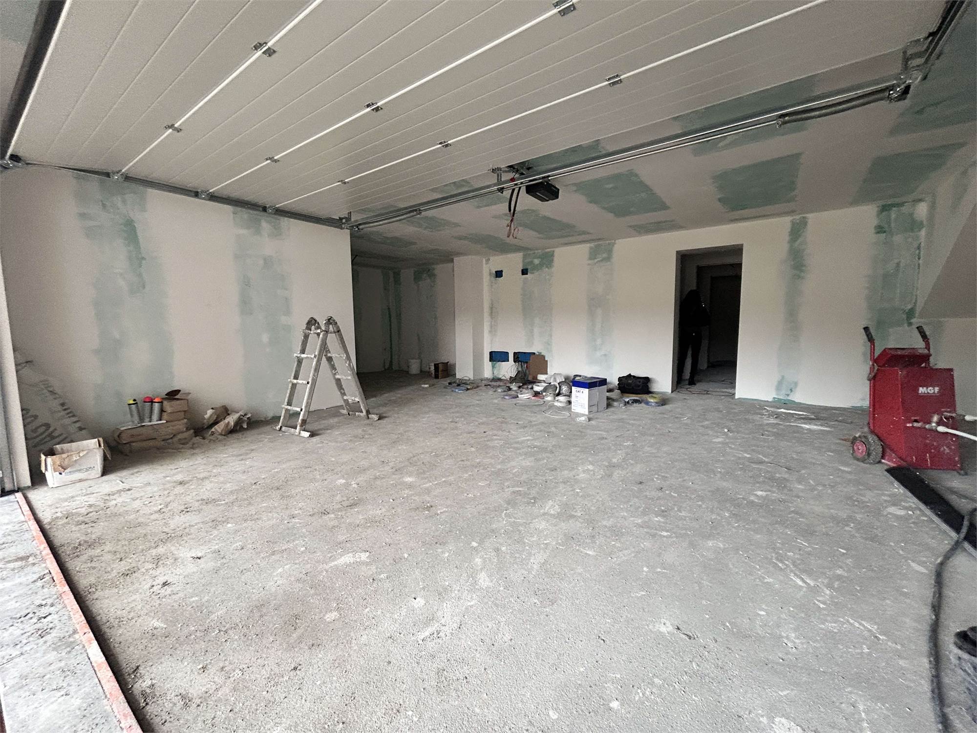 The approximately 93 square meter basement, finished with the same systems, including underfloor heating, houses a spacious basement or multipurpose room, a full bathroom, a laundry room, and a 40 square meter triple garage with an electric overhead door.