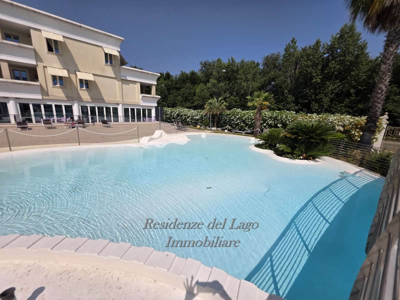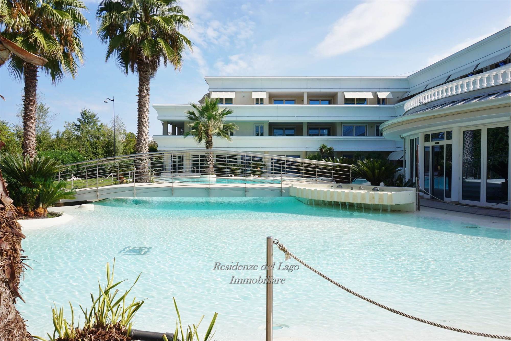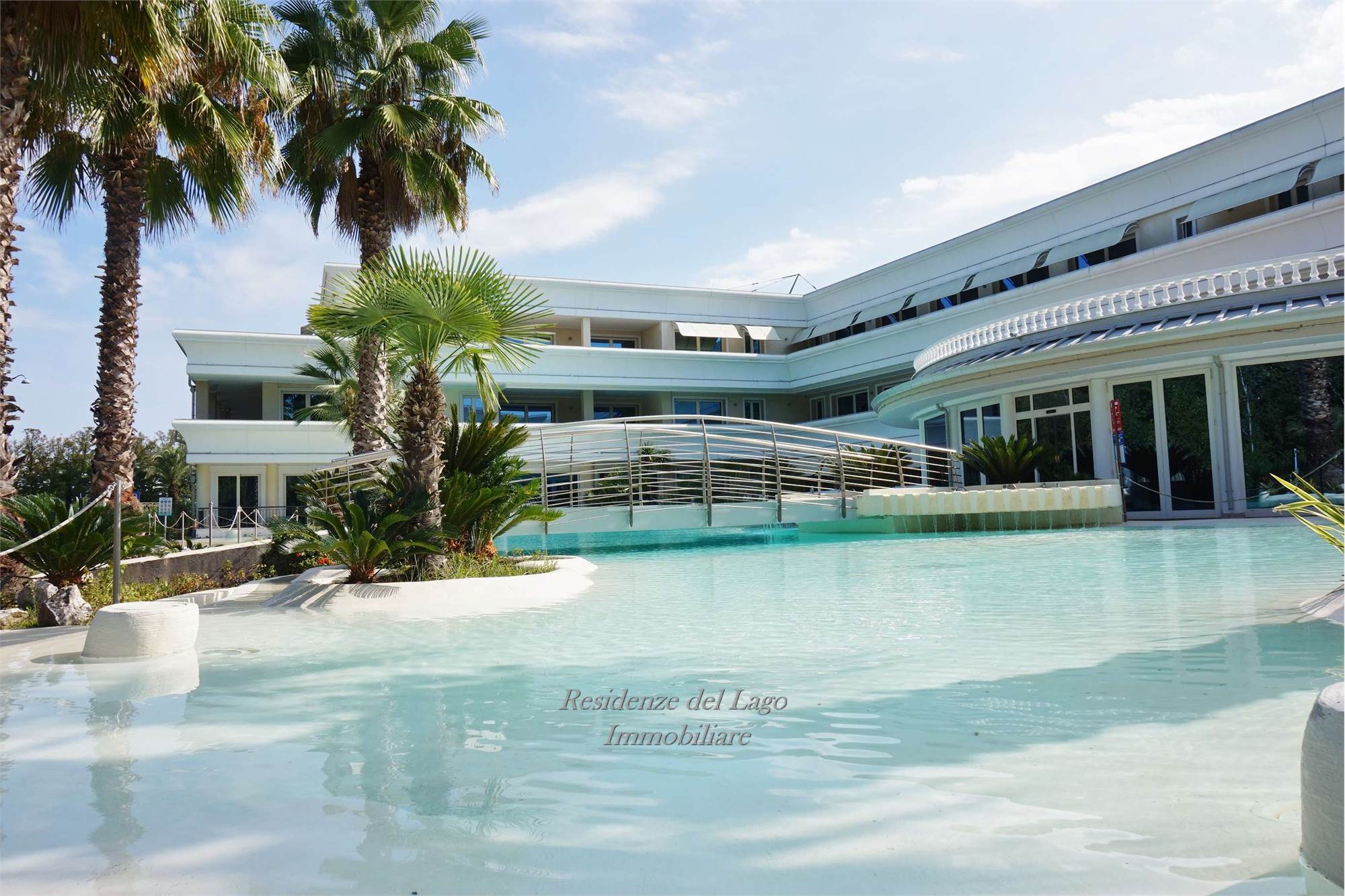 AL CONFINE TRA DESENZANO D/G E SIRMIONE Proponiamo in esclusivo residence con scenografica piscina ampio grande ed elegante appartamento bilocale al piano terra con terrazzo di oltre 30 mq accessibile dalla zona giorno e notte .